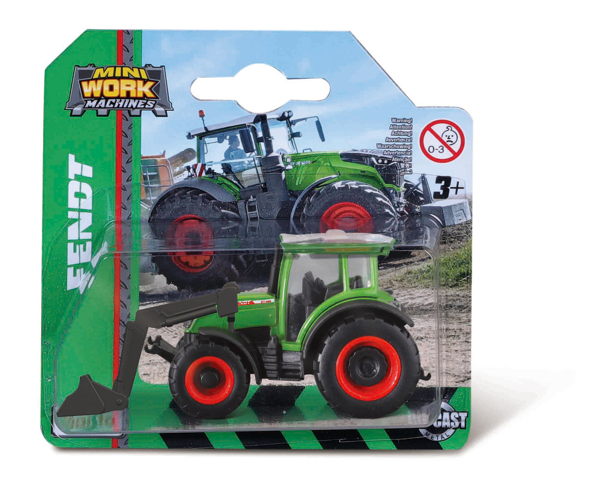 Tracteur Fendt 209 moulé sous pression de 7,6 cm (3 pouces) sous licence officielle, avec roues libres. Le souci du détail est remarquable, avec des roues imposantes, des garde-boue et des cabines ressemblant à des vrais modèles. Chargeur frontal inclus.