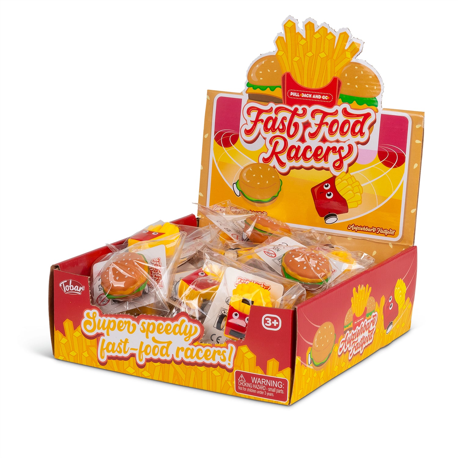 Préparez-vous à faire la course avec votre fast-food préféré ! Ces mini-voitures à rétrofriction, déclinées en modèles amusants de hamburgers et de frites, vous promettent des heures de plaisir rapide. Il suffit de les rétrofrictionner, de les relâcher et de les regarder filer ! Assorties dans un coffret cadeau, elles sont le complément original idéal à toute collection de jouets.