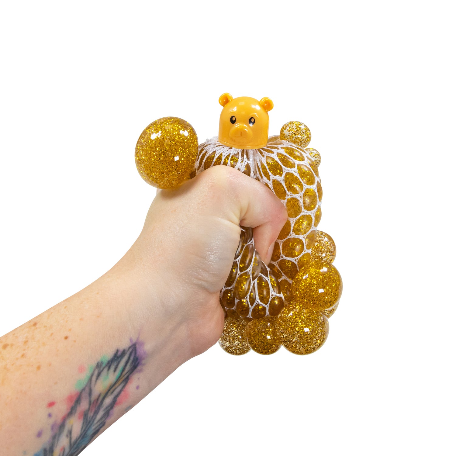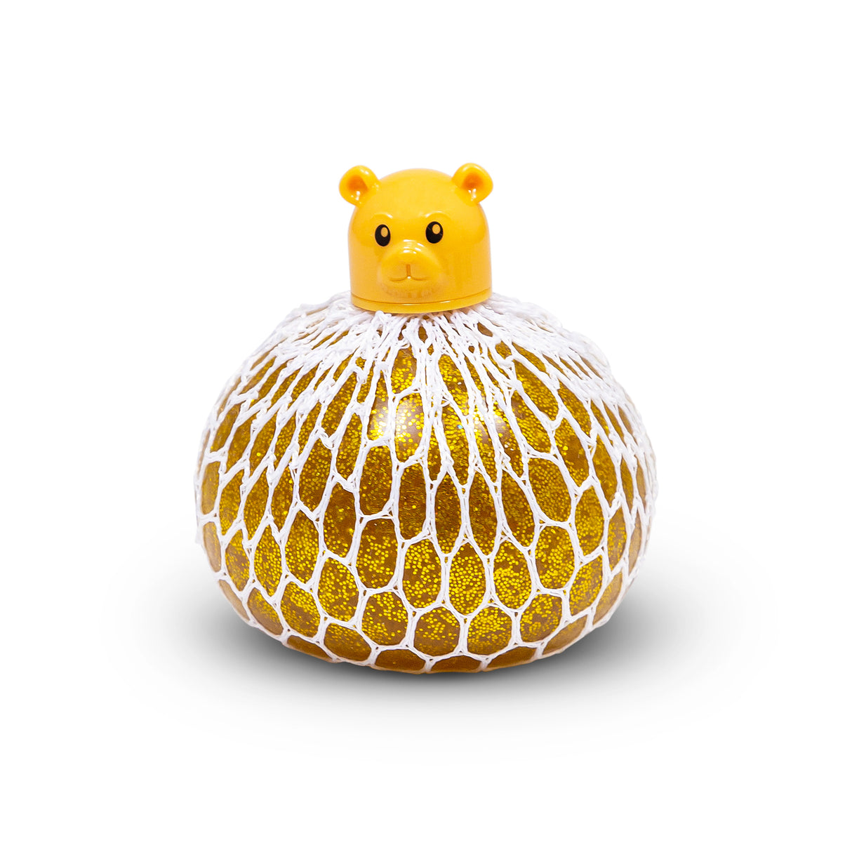 Une balle remplie de gel semblable à du caoutchouc, entourée d'un filet souple et surmontée d'une adorable tête d'ours doré. Pressez-la et elle sortira du filet, faisant apparaître une série de boules moelleuses contenant des confettis colorés.