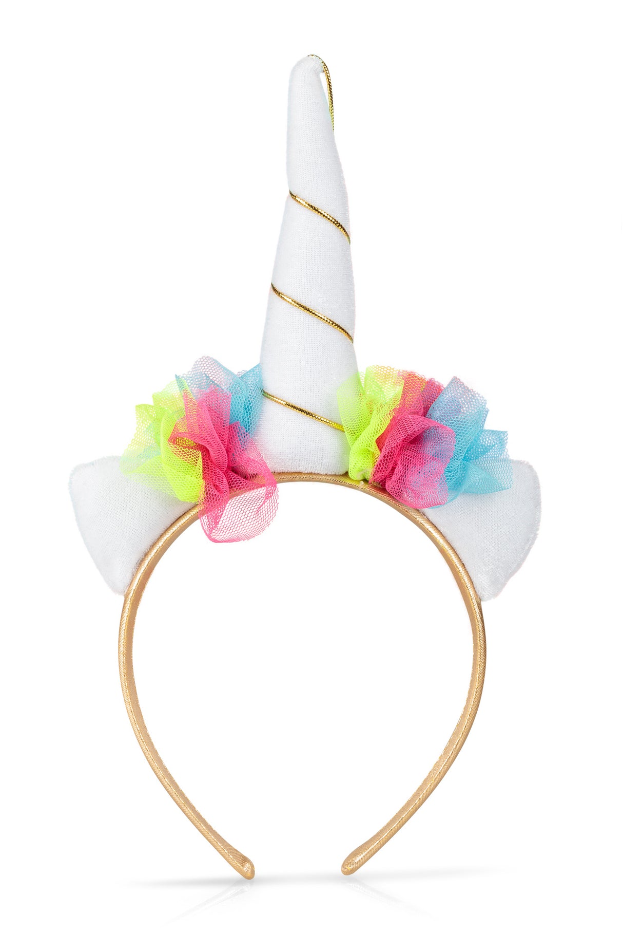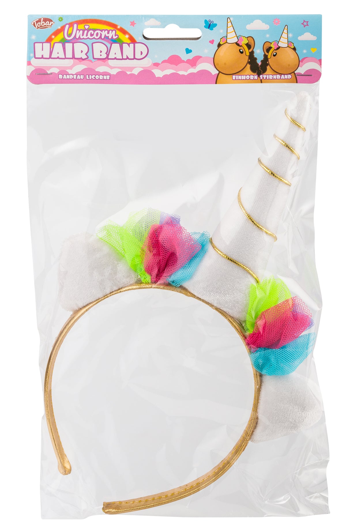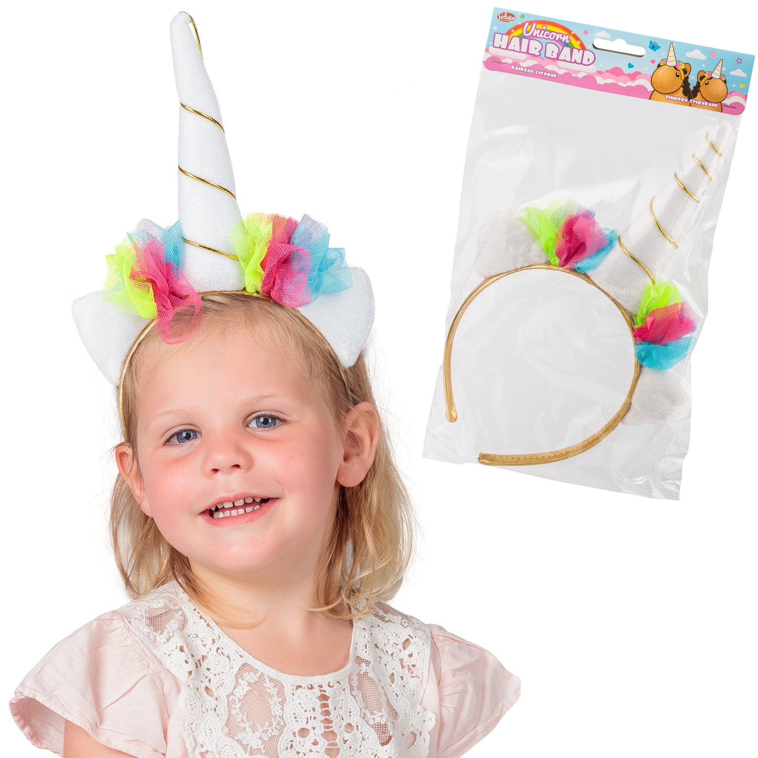 Serre-tête en plastique souple orné d'une corne de licorne, d'oreilles et d'une guirlande de pétales en tissu coloré. Cet accessoire original permet non seulement de maintenir les cheveux en arrière, mais confère également à celui qui le porte l'allure unique d'une licorne magique.