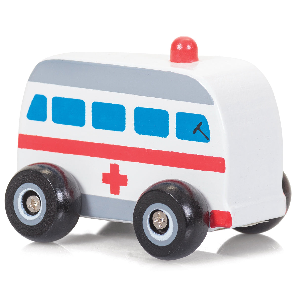 Voiture en bois avec roues à rotation libre et design classique de véhicule britannique. La sélection comprend un bus, un camion de pompiers, une voiture de police et une ambulance.