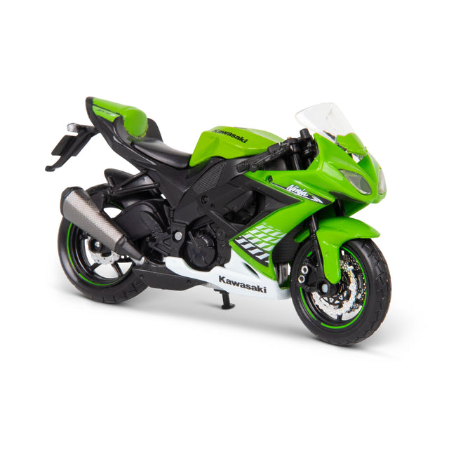 Highly detailed model of a Kawasaki Ninja ZX-10R motorcycle. This beautiful 1:12 scale replica of the bike is packed with authentic features that make it the spitting image of the original. From the exhaust pipe right up to the handlebars, every detail has been accurately recreated to make this model truly impressive.