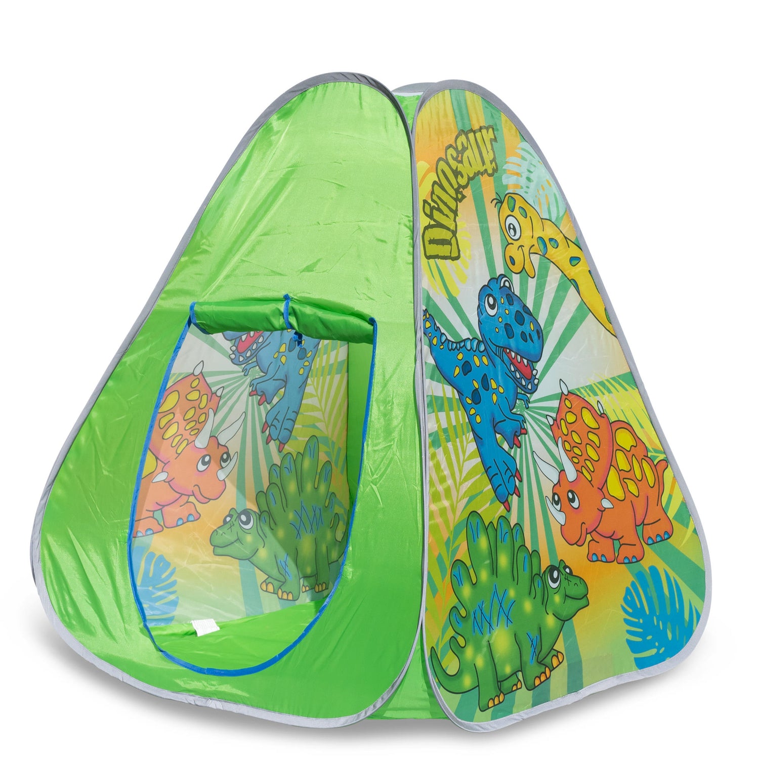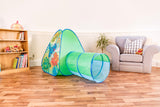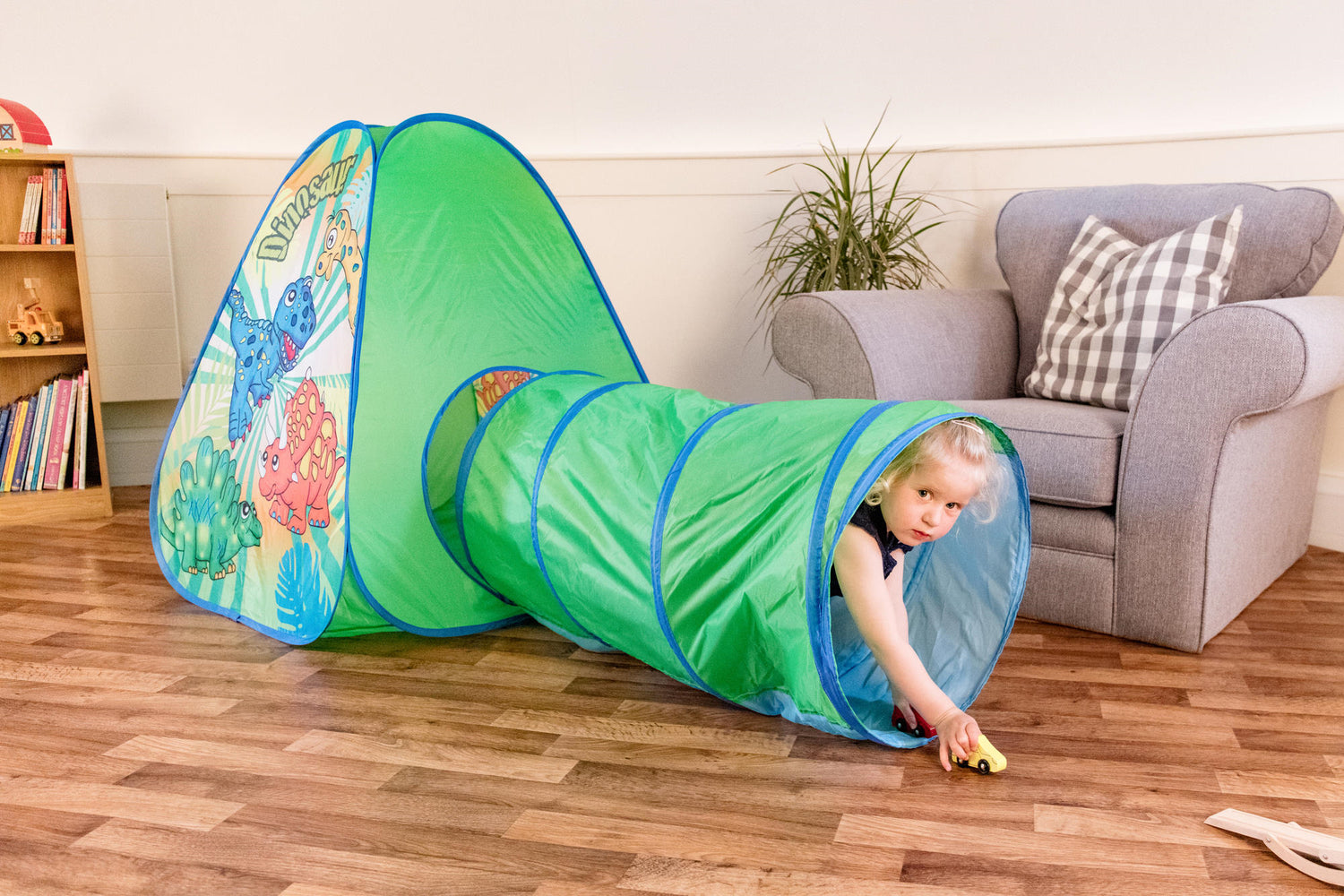 Dinosaur themed pop up play tent with a tunnel that leads into it. Simply remove it from the packaging and the tent takes shape, with canvas cover walls and a cylindrical tunnel instantly popping up into a rigid structure. It's covered with cheery dino designs and provides a fun space that's suitable for play both indoors and out in the garden.