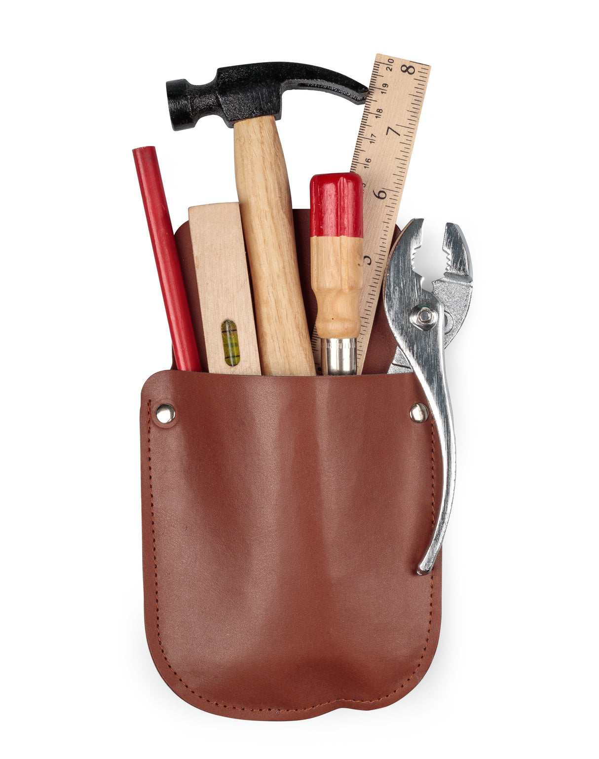 Fully functional, child-sized hammer, pliers, screwdriver, spirit level, rule and chunky pencil, made from a combination of wood and metal - just like the 'real' thing! The tools are stored in a leather-effect pouch, which can be slipped onto a belt.