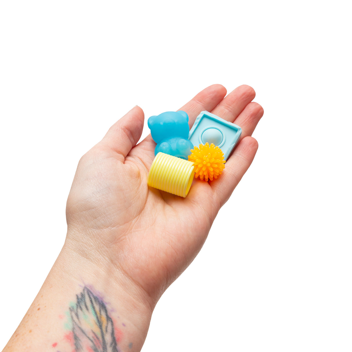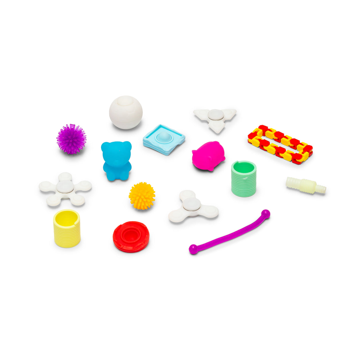 An assortment of 5 collectable micro fidget toys packaged inside a surprise container pod.