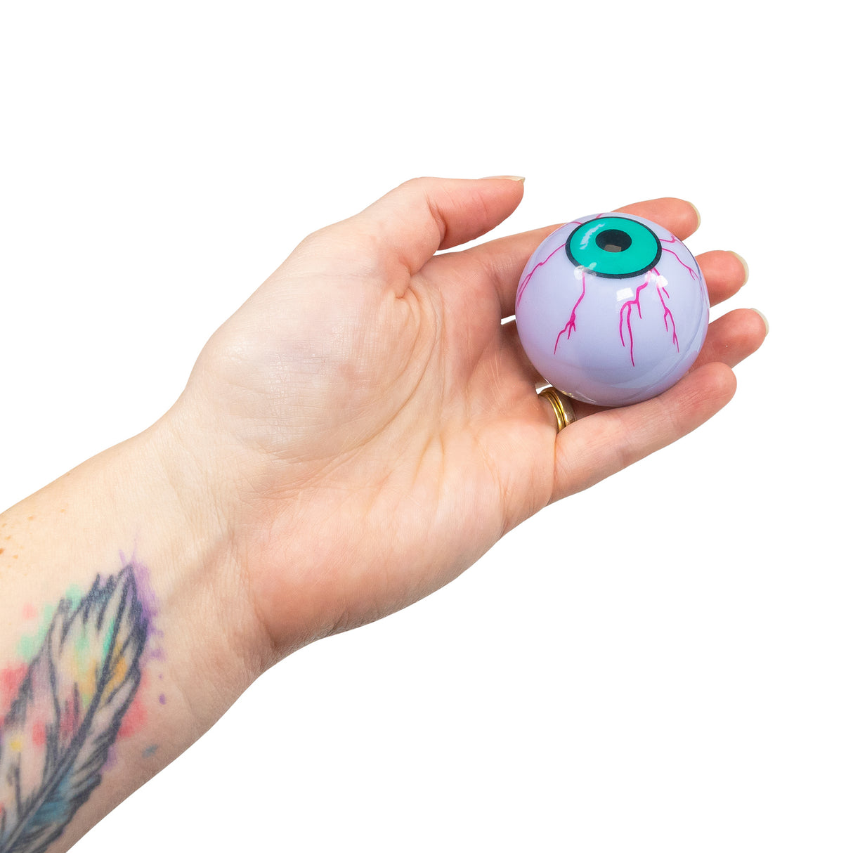Large (golf-ball size) glide ball with internal LEDs which flash in sequence when activated. Made of tough plastic with floating eyeball in liquid inside. Batteries included.